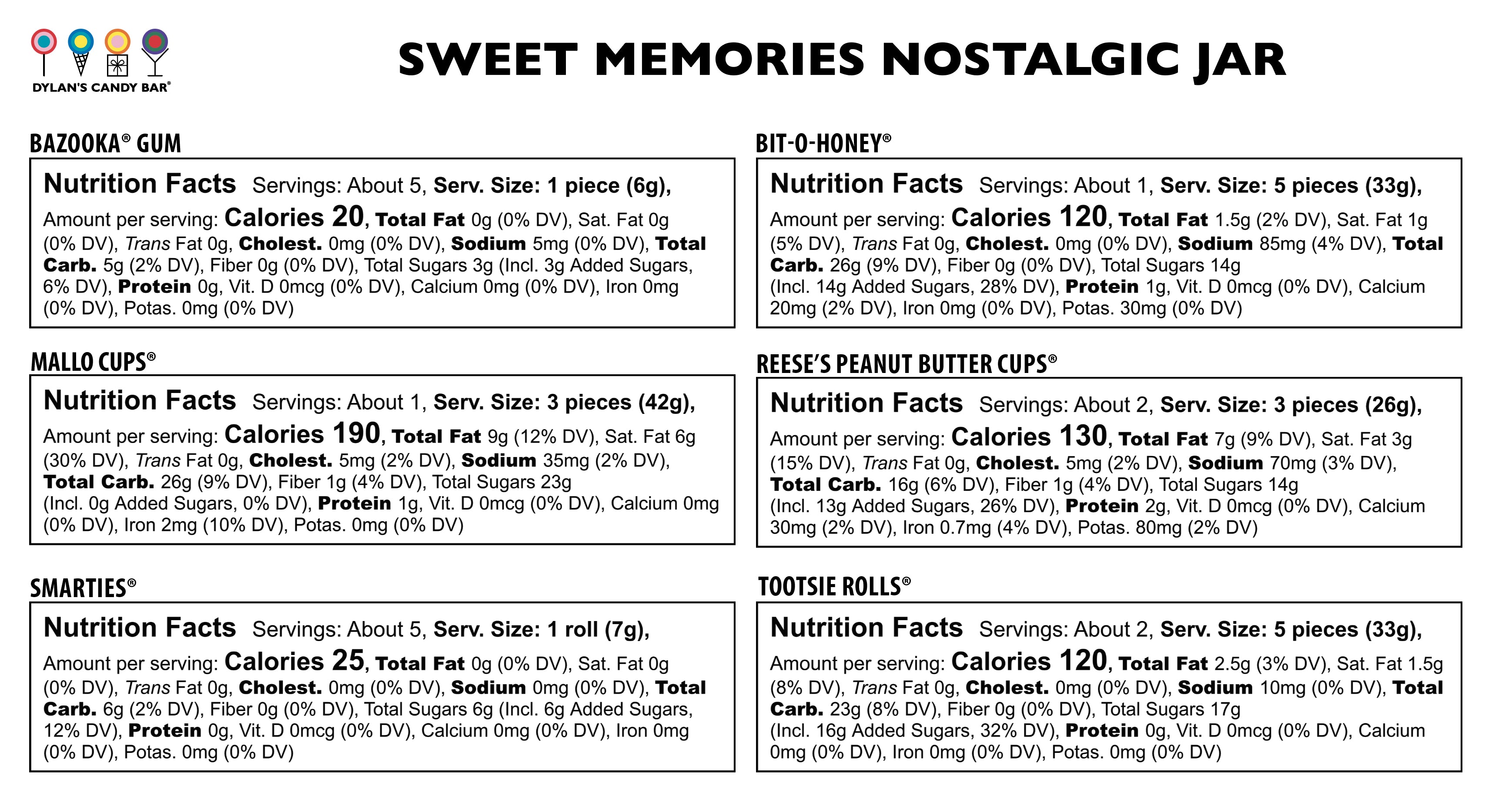 Stuffed with an assortment of retro treats, our Sweet Memories Nostalgic Candy Mix is sure to bring back sweet memories! Once all the candies are gone, the Dylan’s Candy Bar glass jar can be used to store more treats.